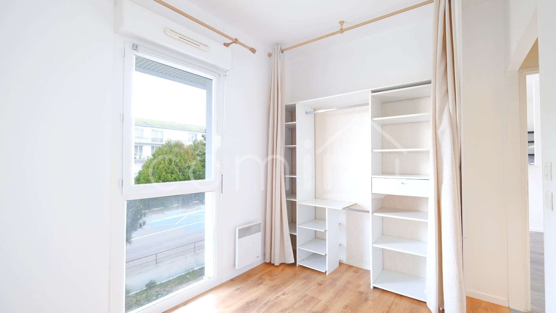 Un dégagement avec penderie dessert une chambre lumineuse avec fenêtre à allège, ainsi qu’une salle d’eau rénovée et un WC suspendu.