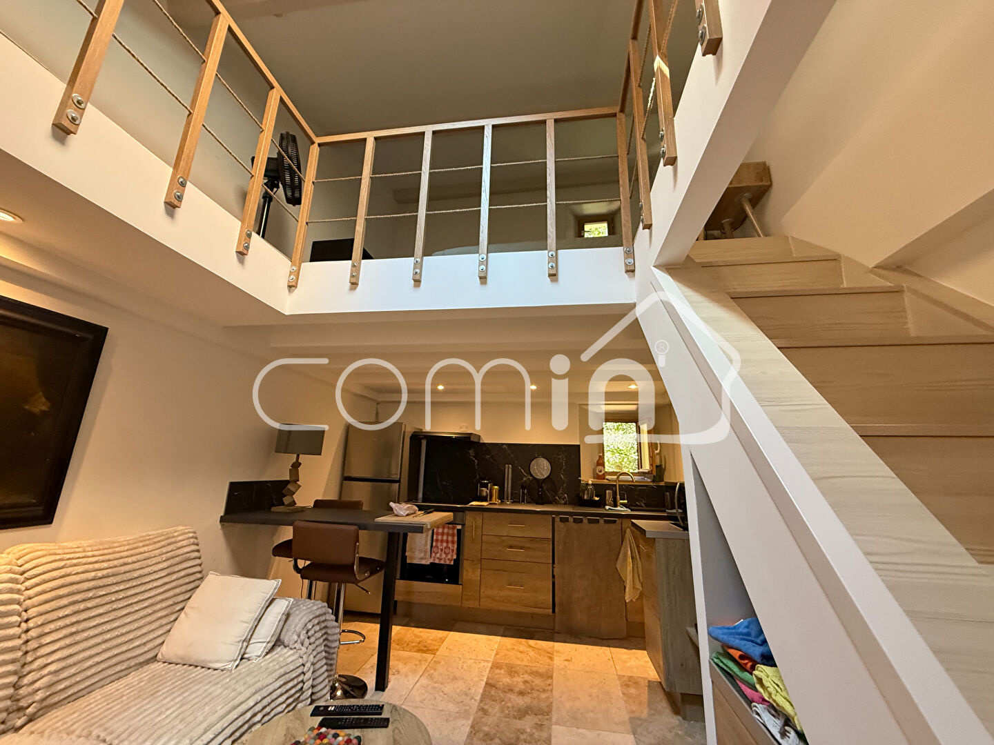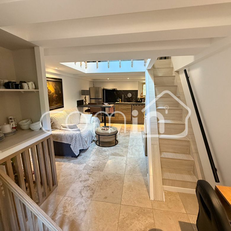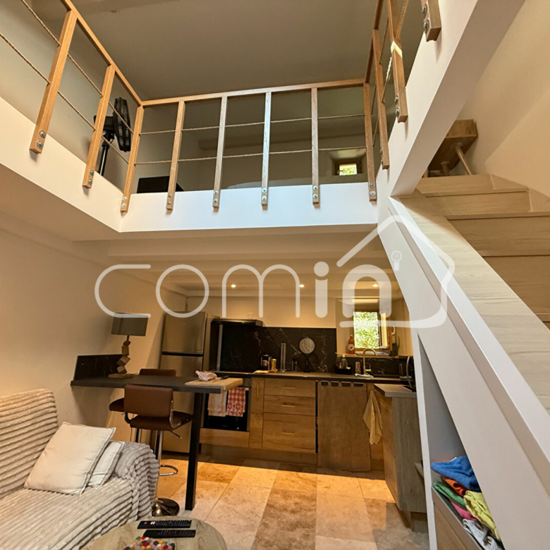 _Premier étage: un séjour traversant avec cuisine ouverte (entièrement équipée et aménagée) et une mezzanine aménagée en chambre.