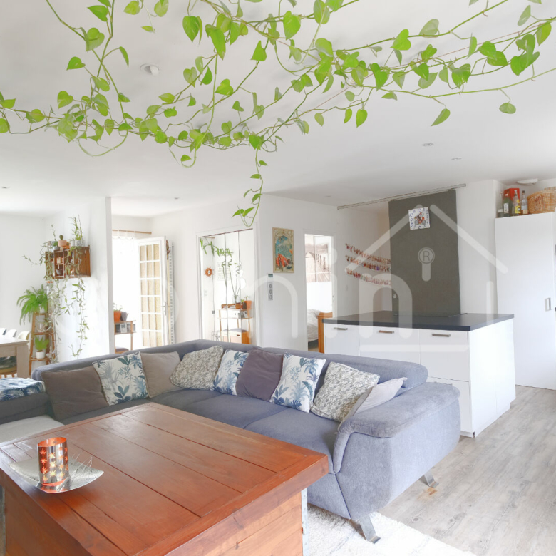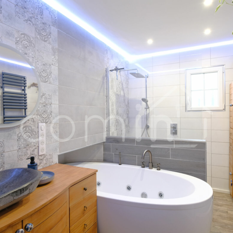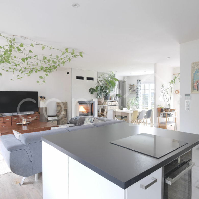 Cette belle maison de plain-pied en grande partie renovée est composée d’une entrée avec dressing, un grand et agréable séjour de 45m² composé d’une cuisine entièrement équipée avec ilot central, un coin salon avec cheminée bois et une salle à manger ouverte sur la terrasse de 50m².