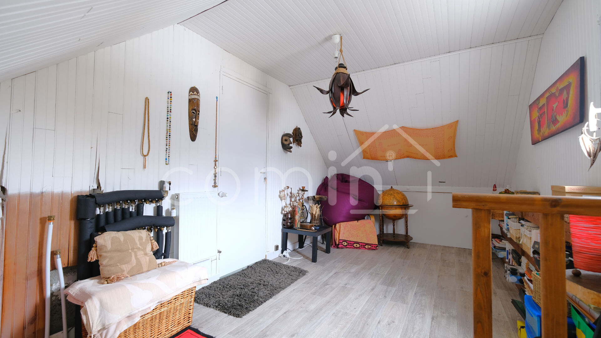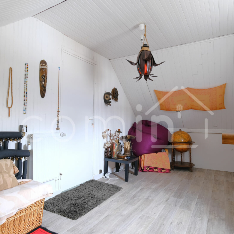 Á l’étage, une chambre avec accès indépendant mène aux combles aménageables de 60m² au sol.