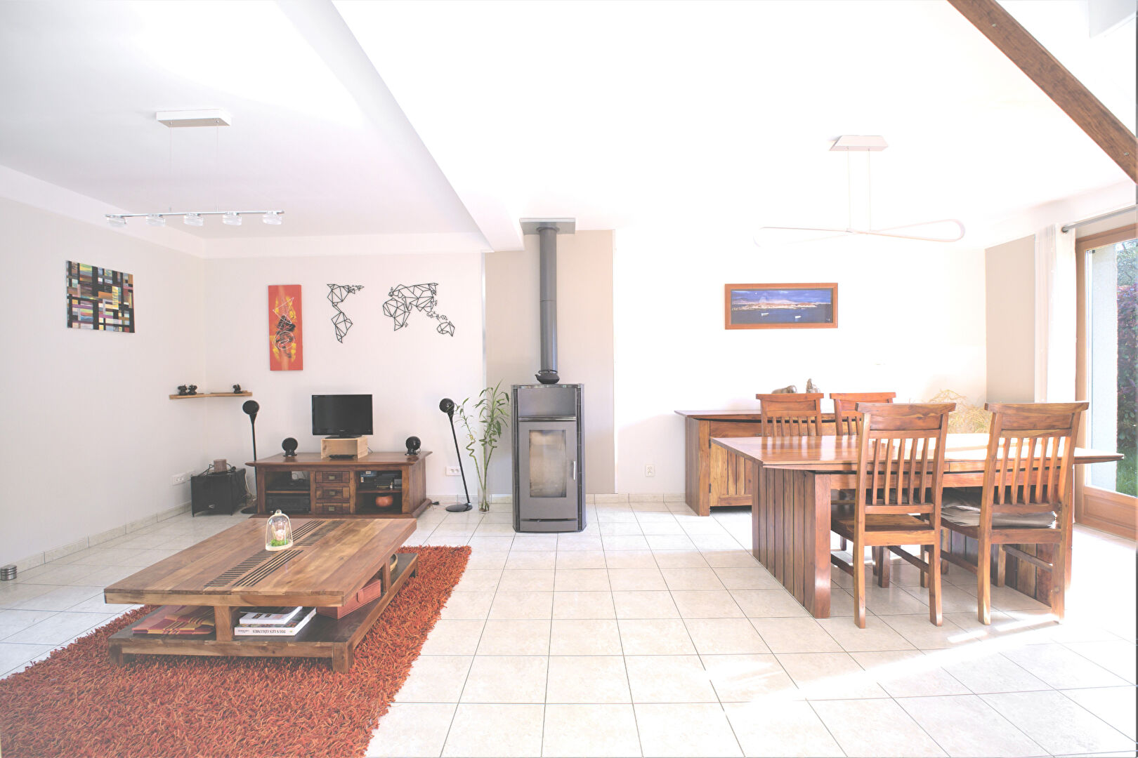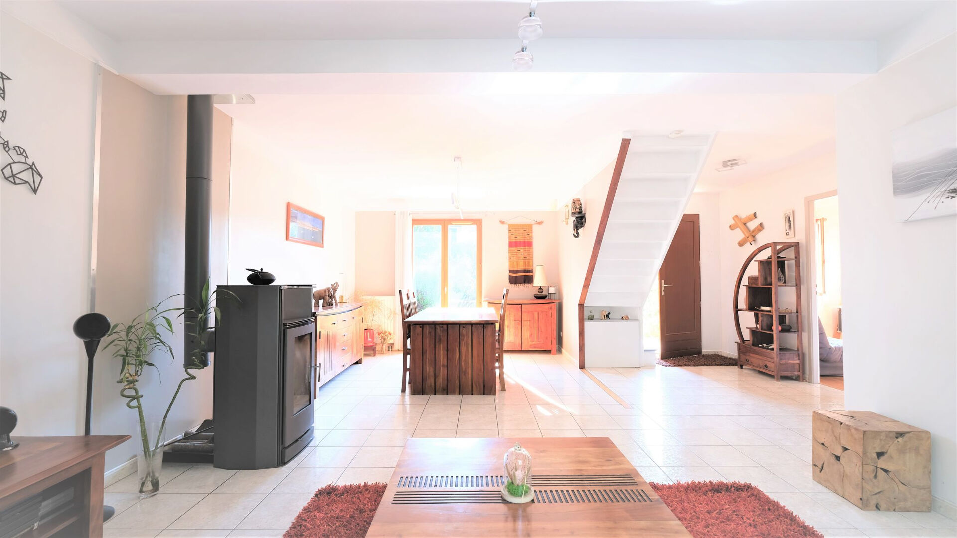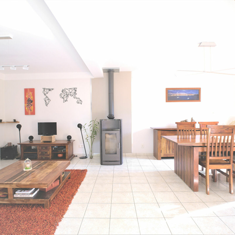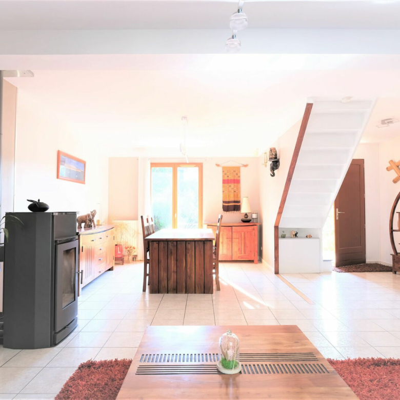 Ce beau pavillon de deux niveaux est composé d’une entrée, un beau double séjour traversant de 34m² avec Poêle à bois et accès direct sur terrasse et Jardin, une grande cuisine équipée de 11m², un bureau, une salle d’eau entièrement rénovée et son WC.