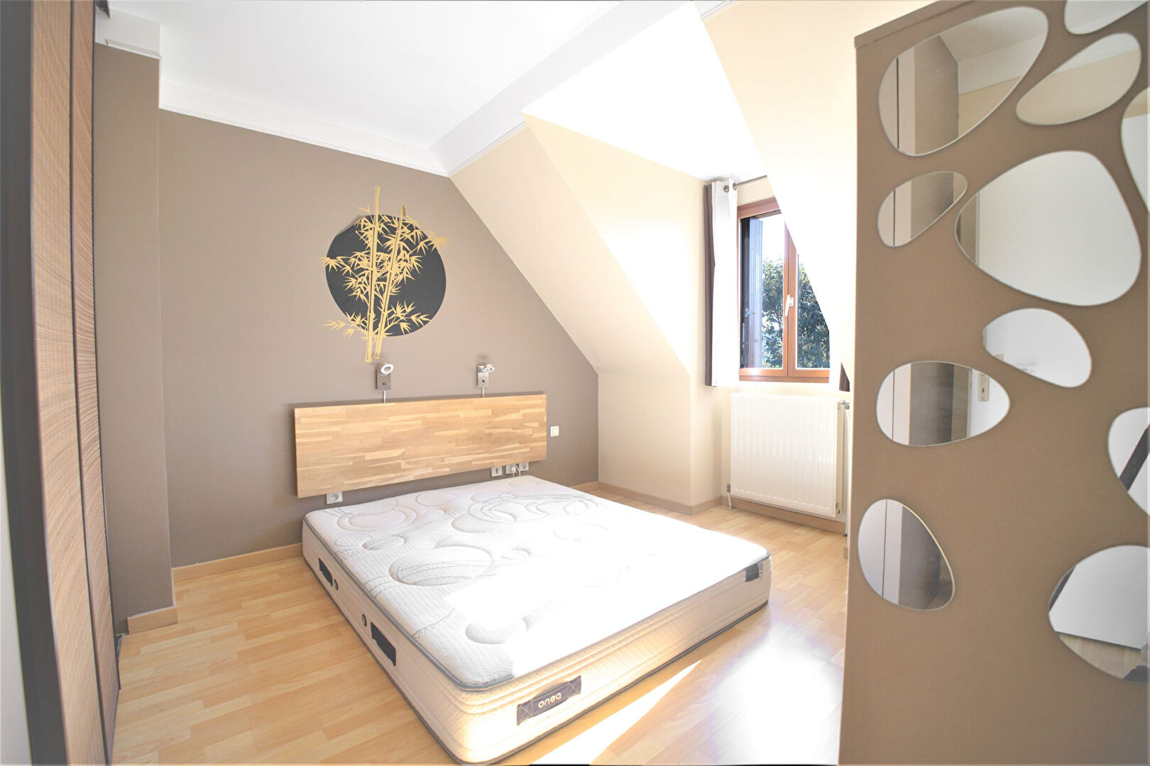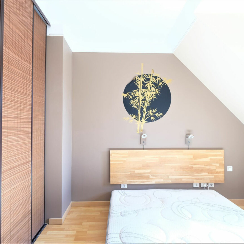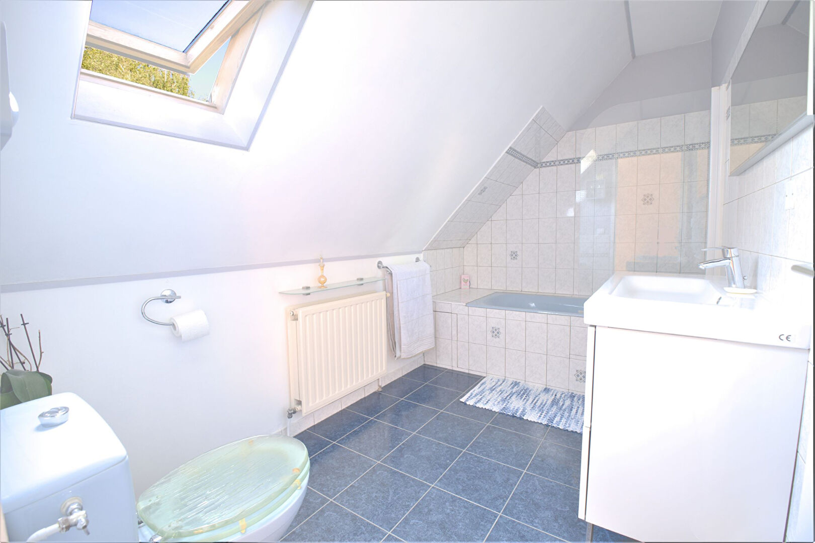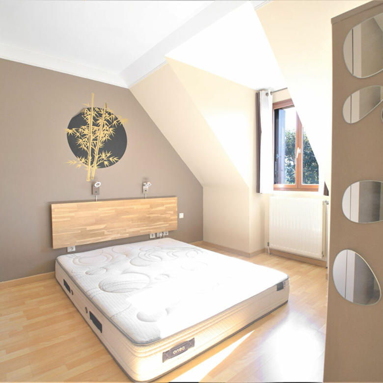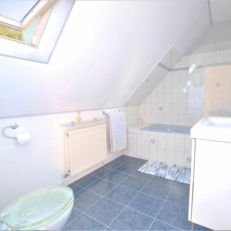 Á l’étage, un palier avec penderie et rangements dessert une salle de bain avec baignoire et WC ainsi que trois belles chambres avec rangements.