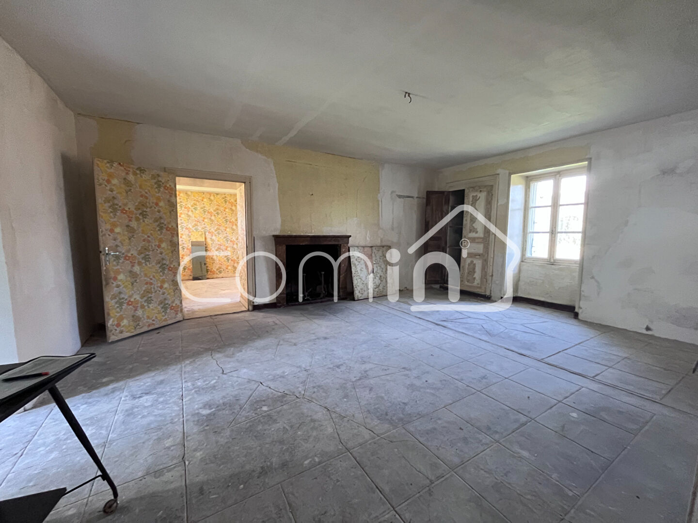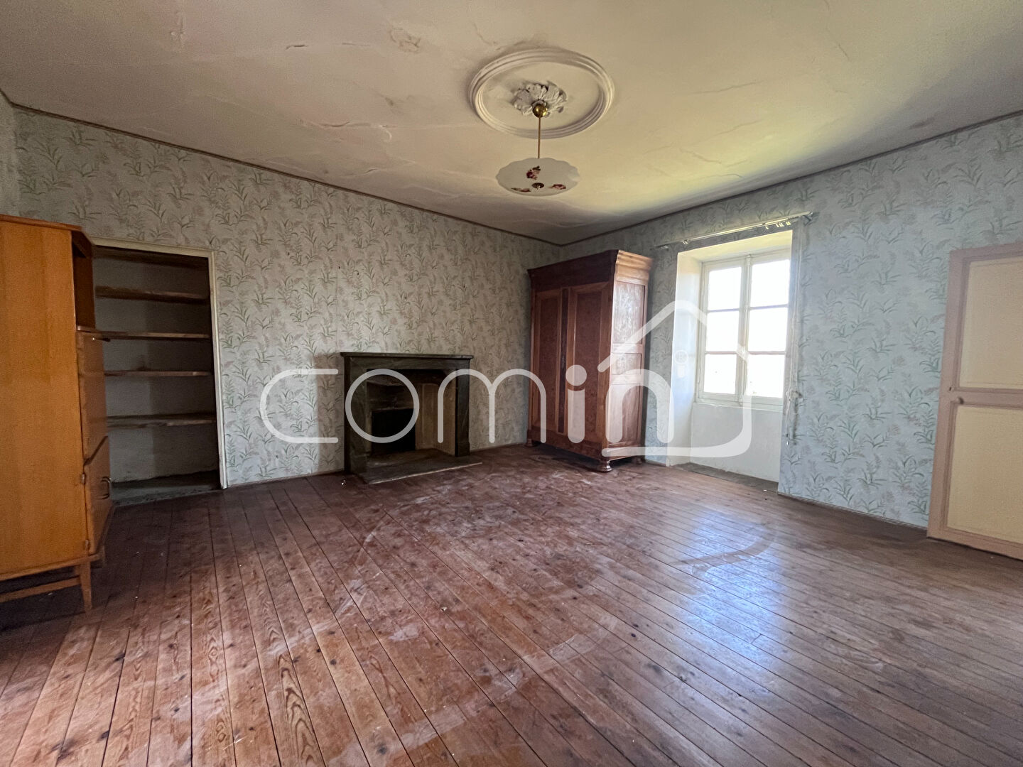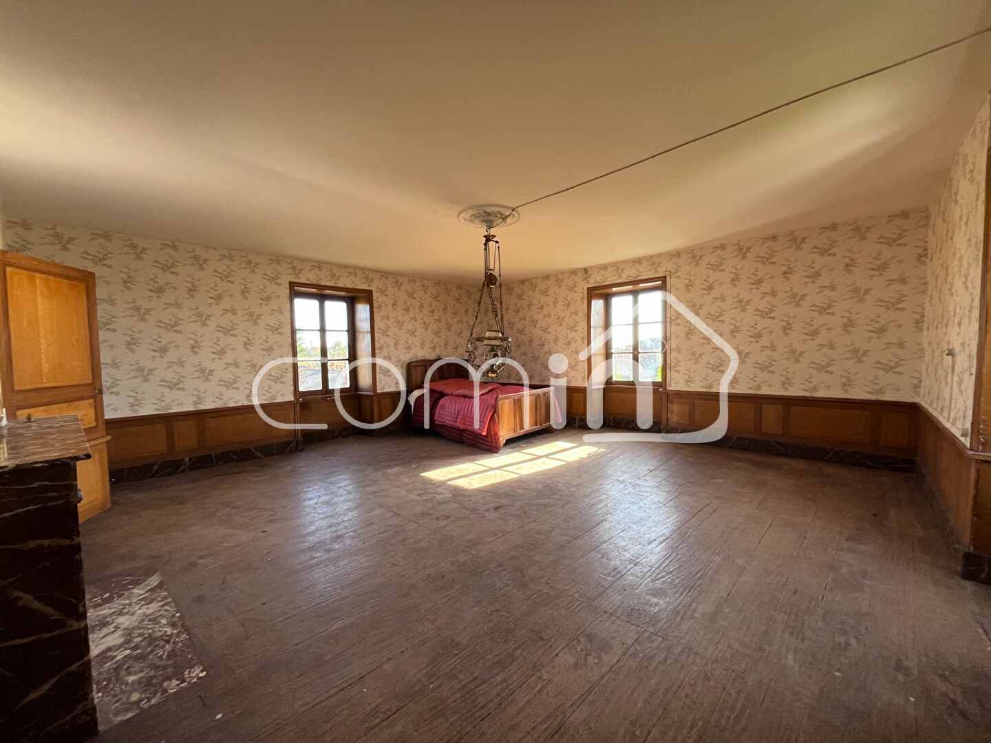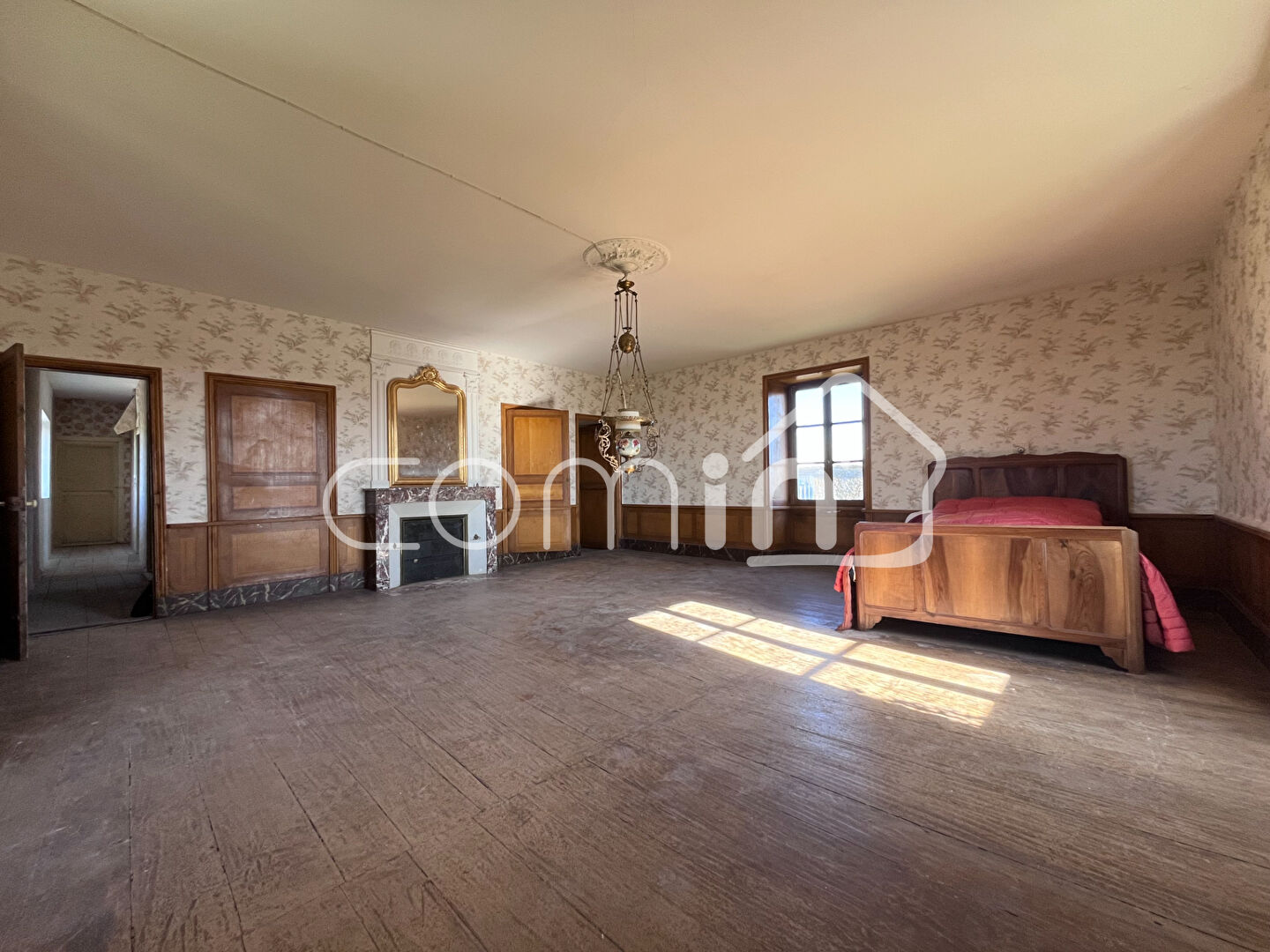 A l’étage un palier dessert une chambre de 37m² en triple exposition avec cheminée, 2 autres chambres ainsi qu’une pièce de 55m² aménageable et une cave.