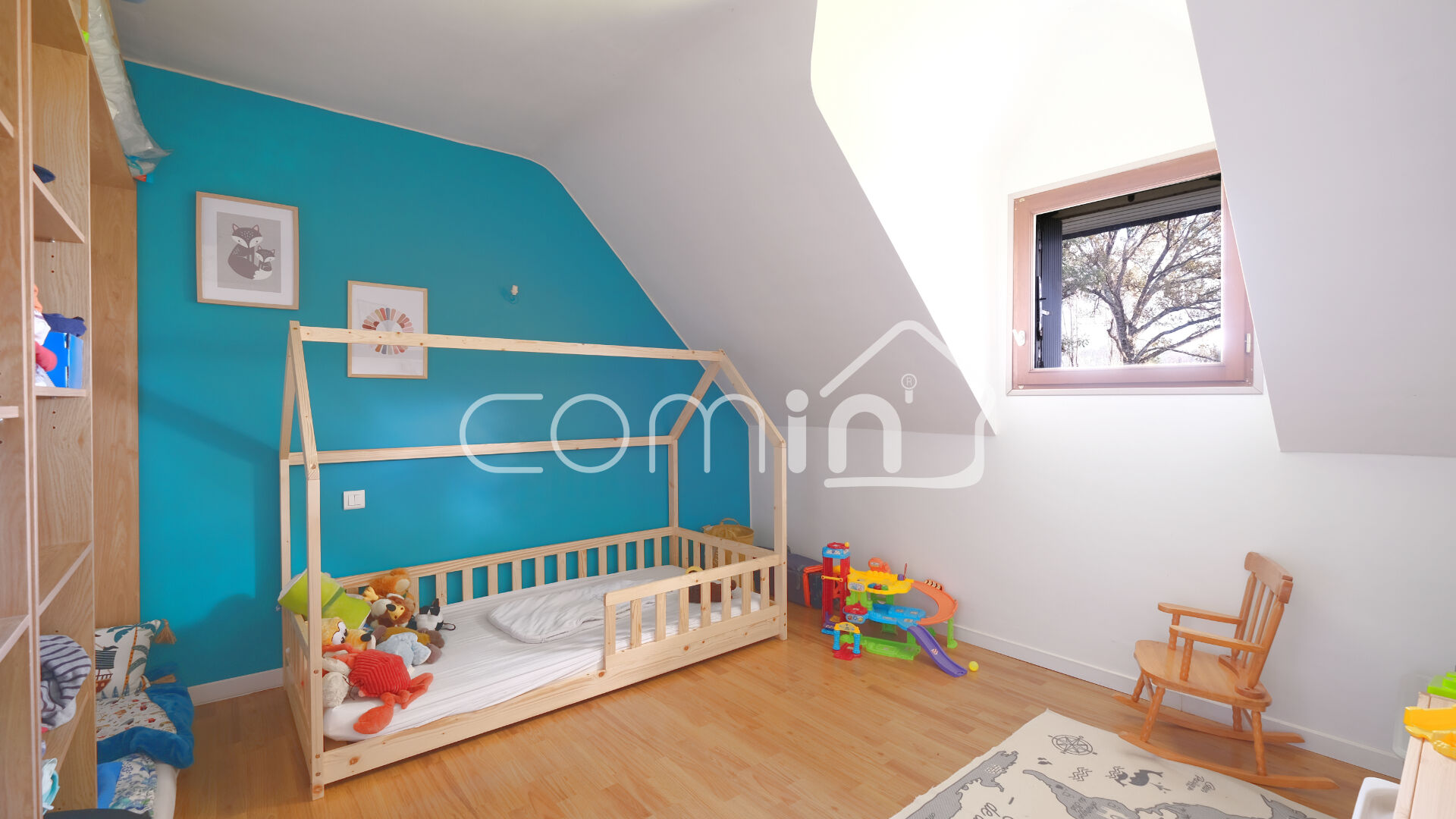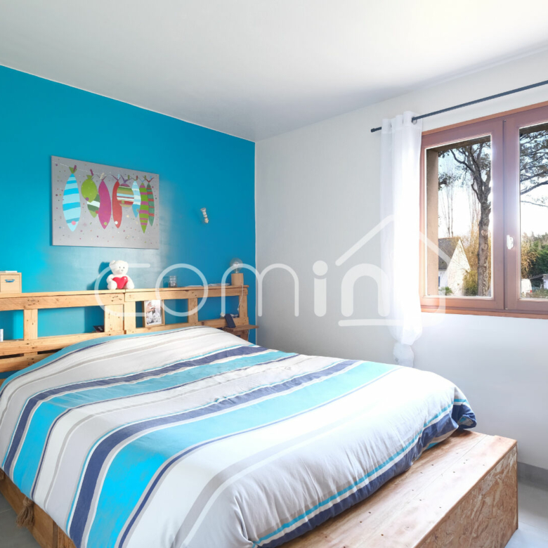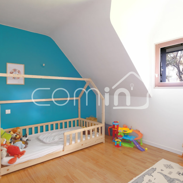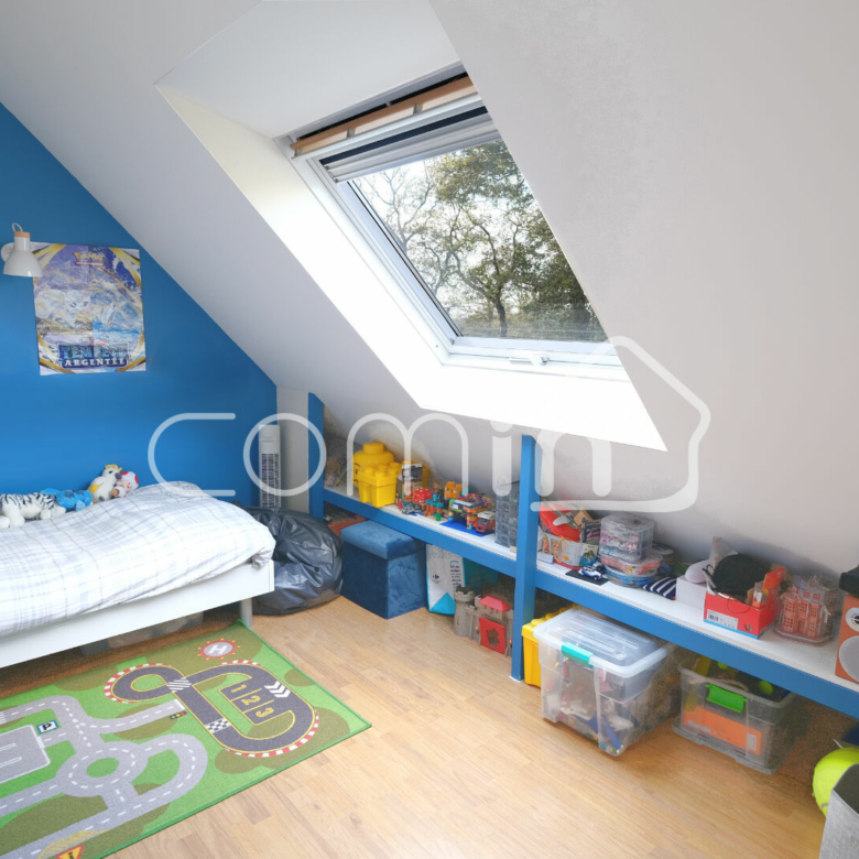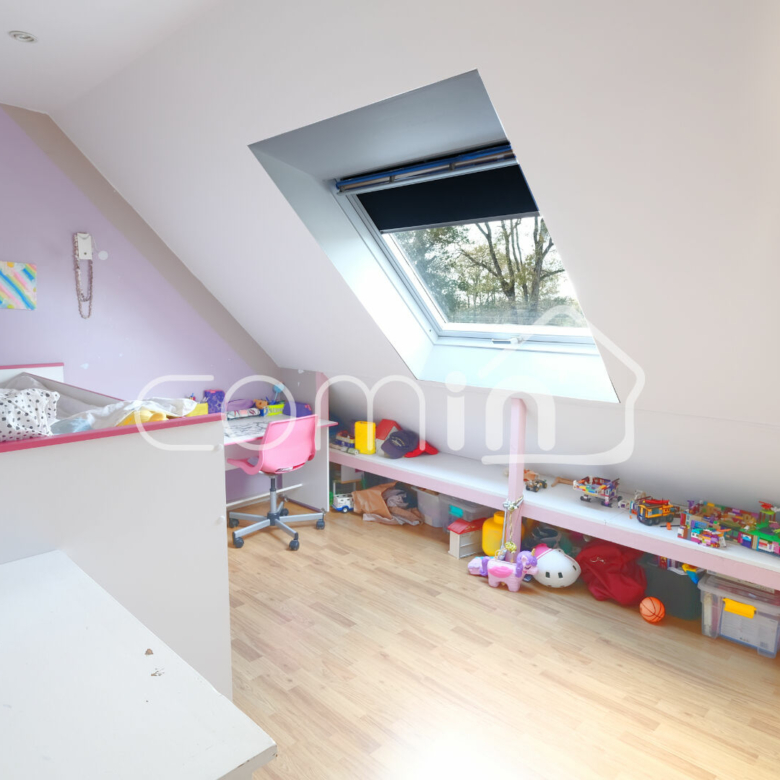 L’étage est composé de trois chambres avec rangements et une salle de bain avec WC.