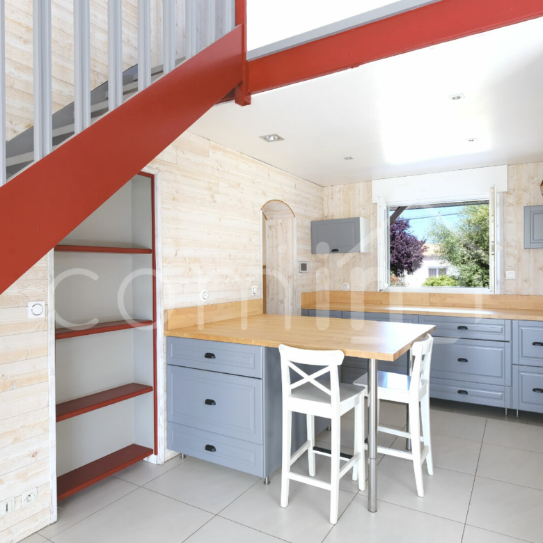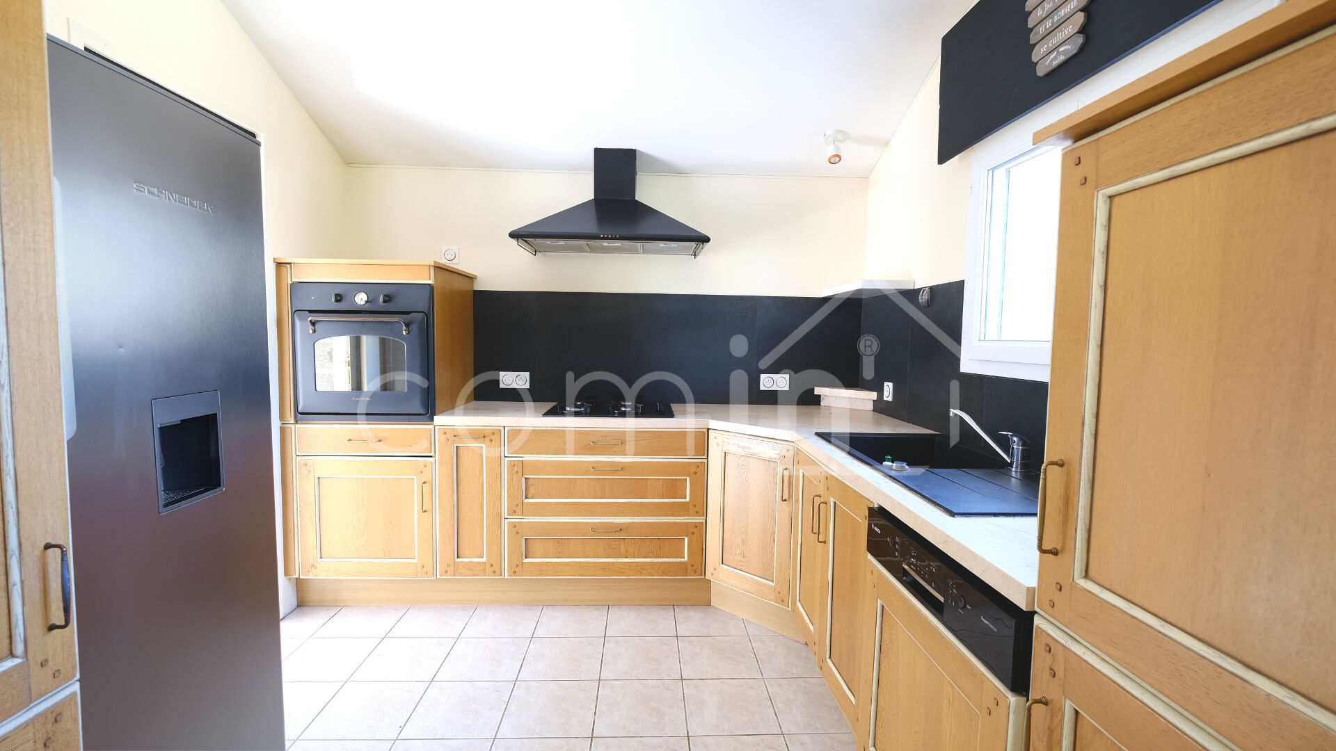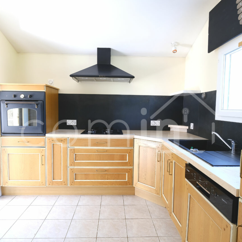 Une cuisine aménagée et équipée (four, plaques gaz et lave-vaisselle), une buanderie, un bureau et un WC.