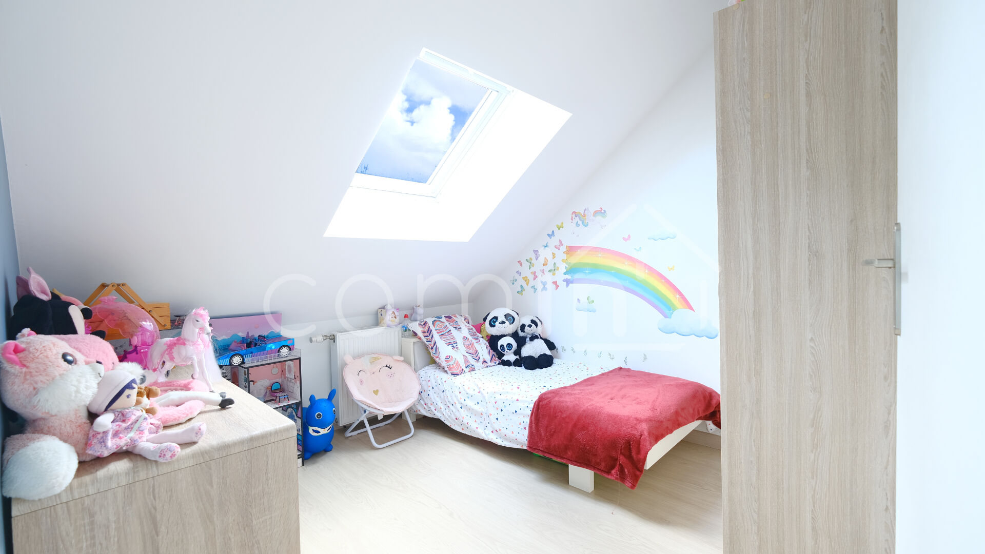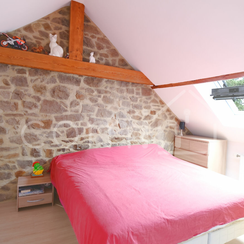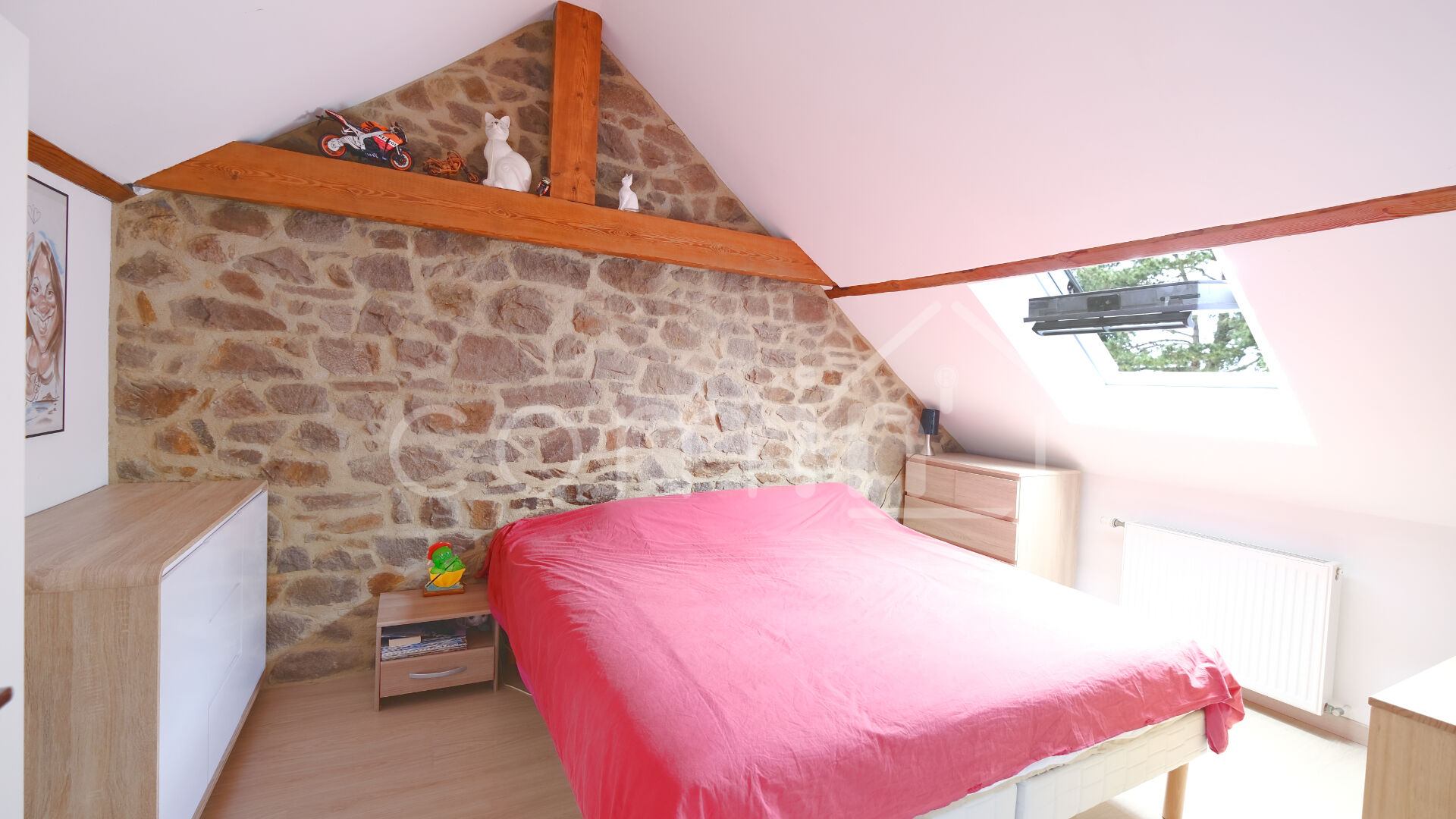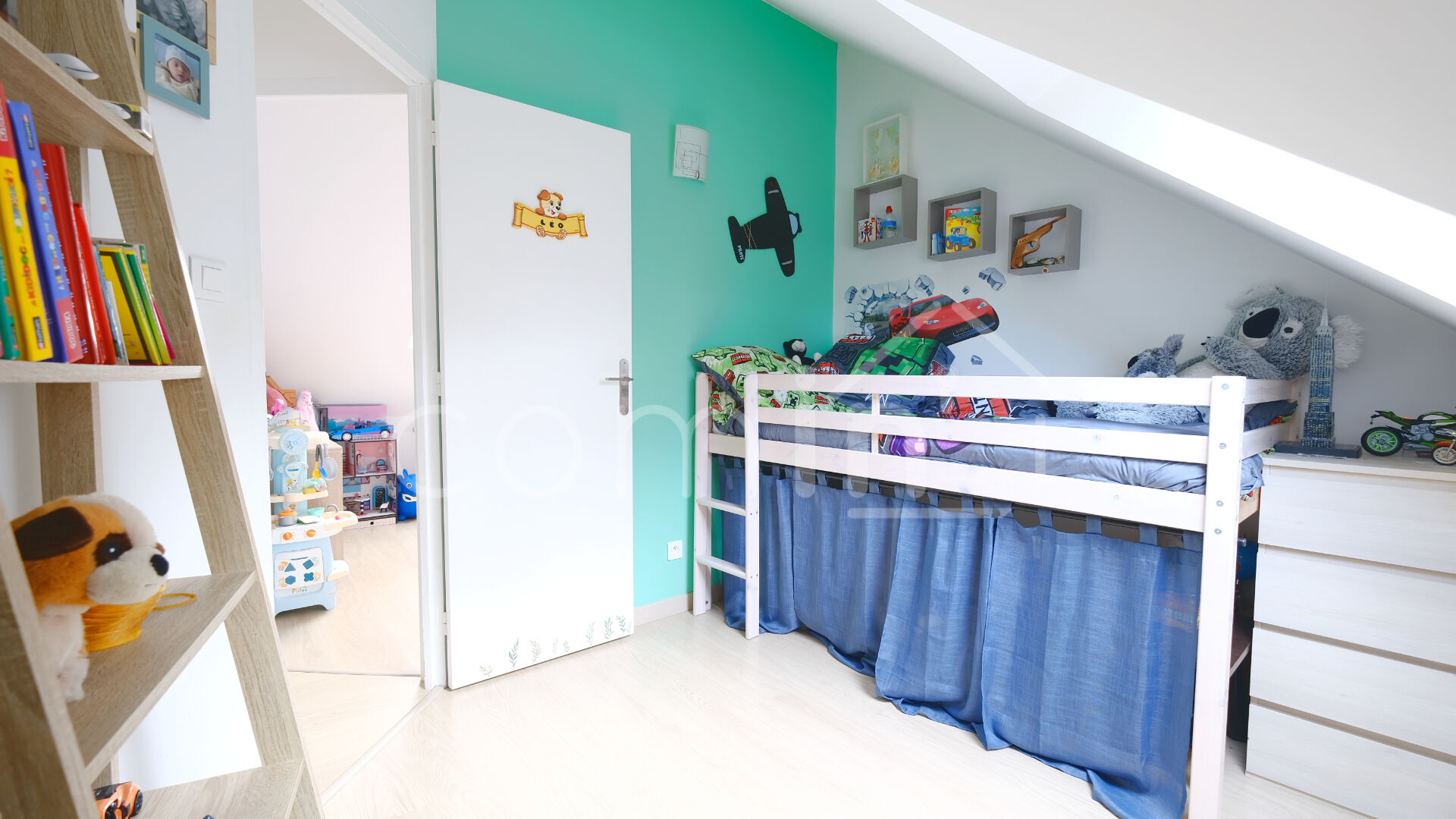 A l’étage, un couloir dessert une chambre parentale avec rangements, deux chambres mansardées ainsi qu’une salle d’eau avec WC.