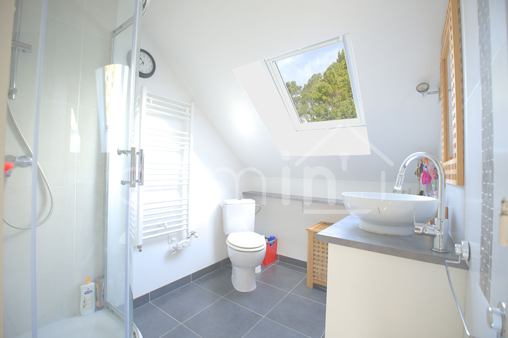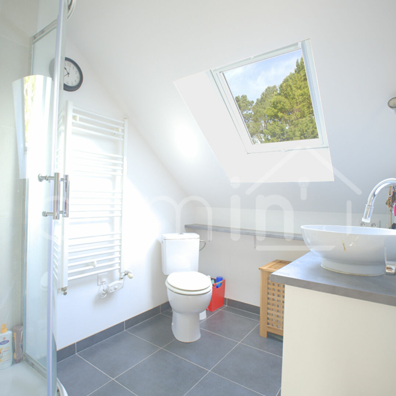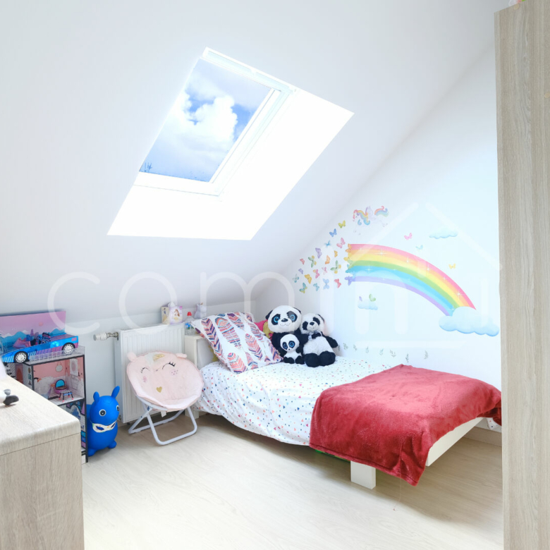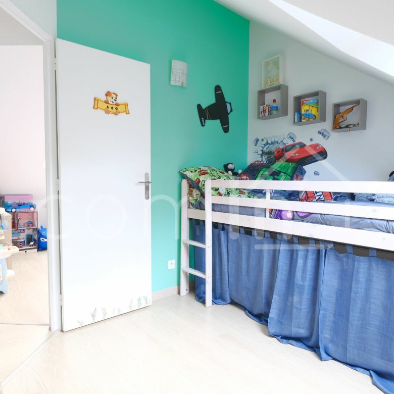 A l’étage, un couloir dessert une chambre parentale avec rangements, deux chambres mansardées ainsi qu’une salle d’eau avec WC.