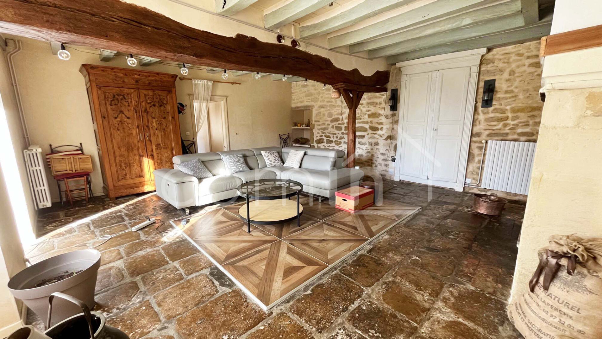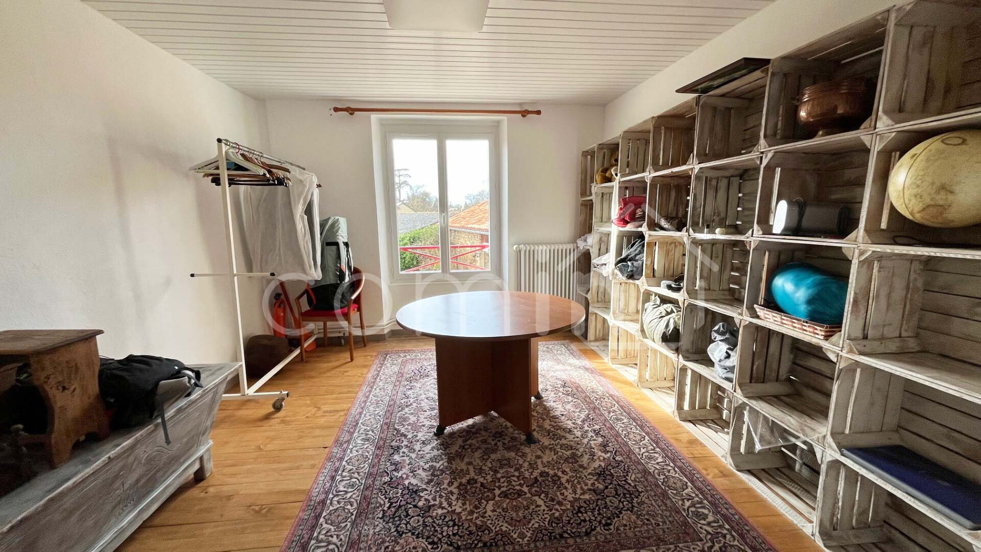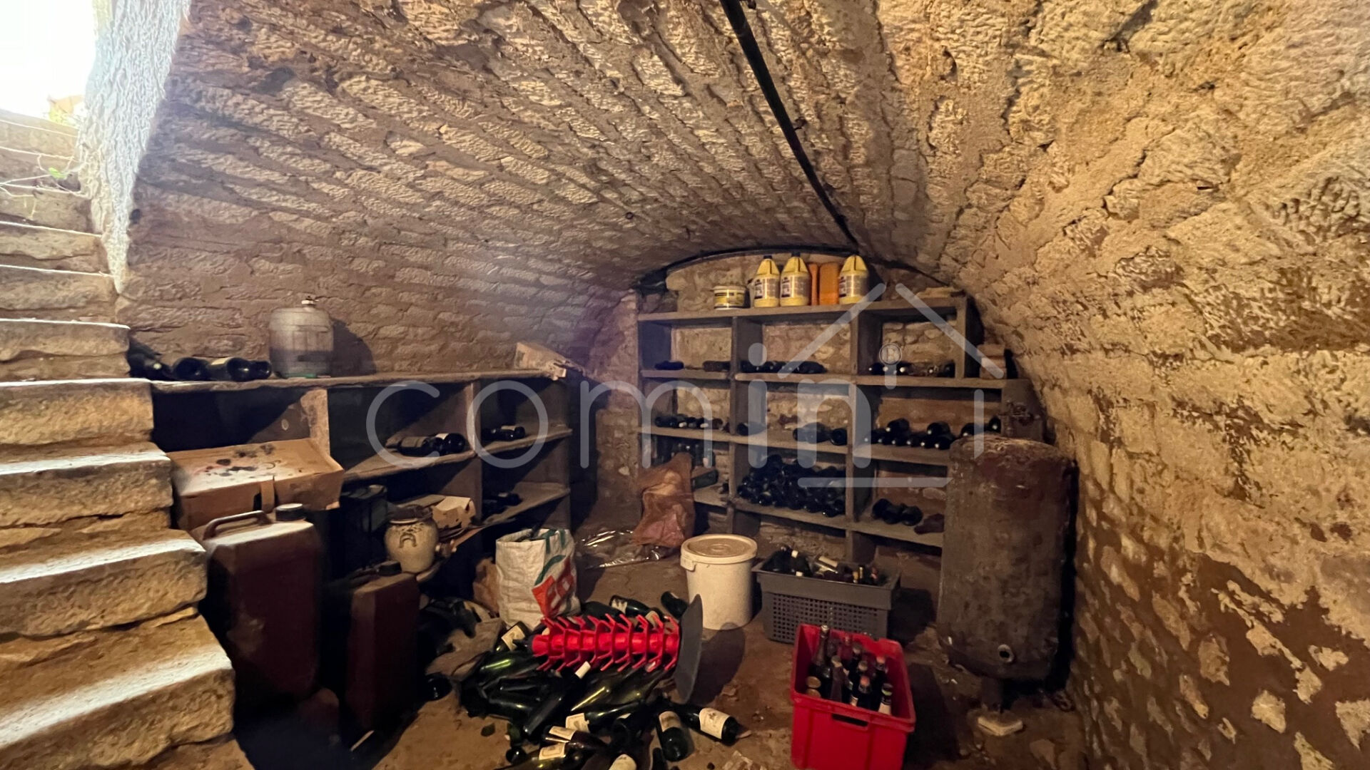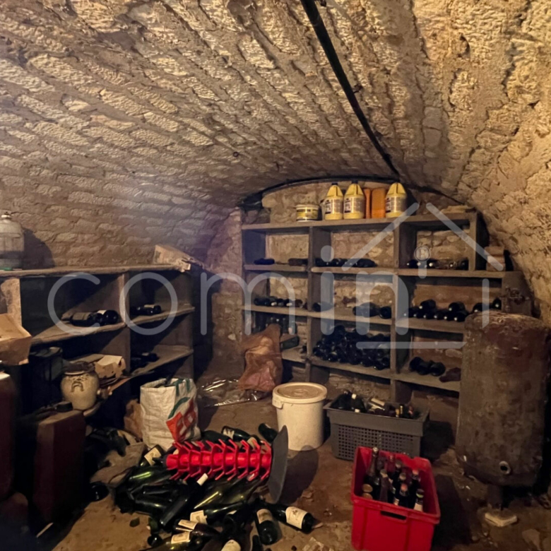 Le chai est divisé en entrée, une pièce, une salle d’eau, un wc et une grande chambre à l’étage.