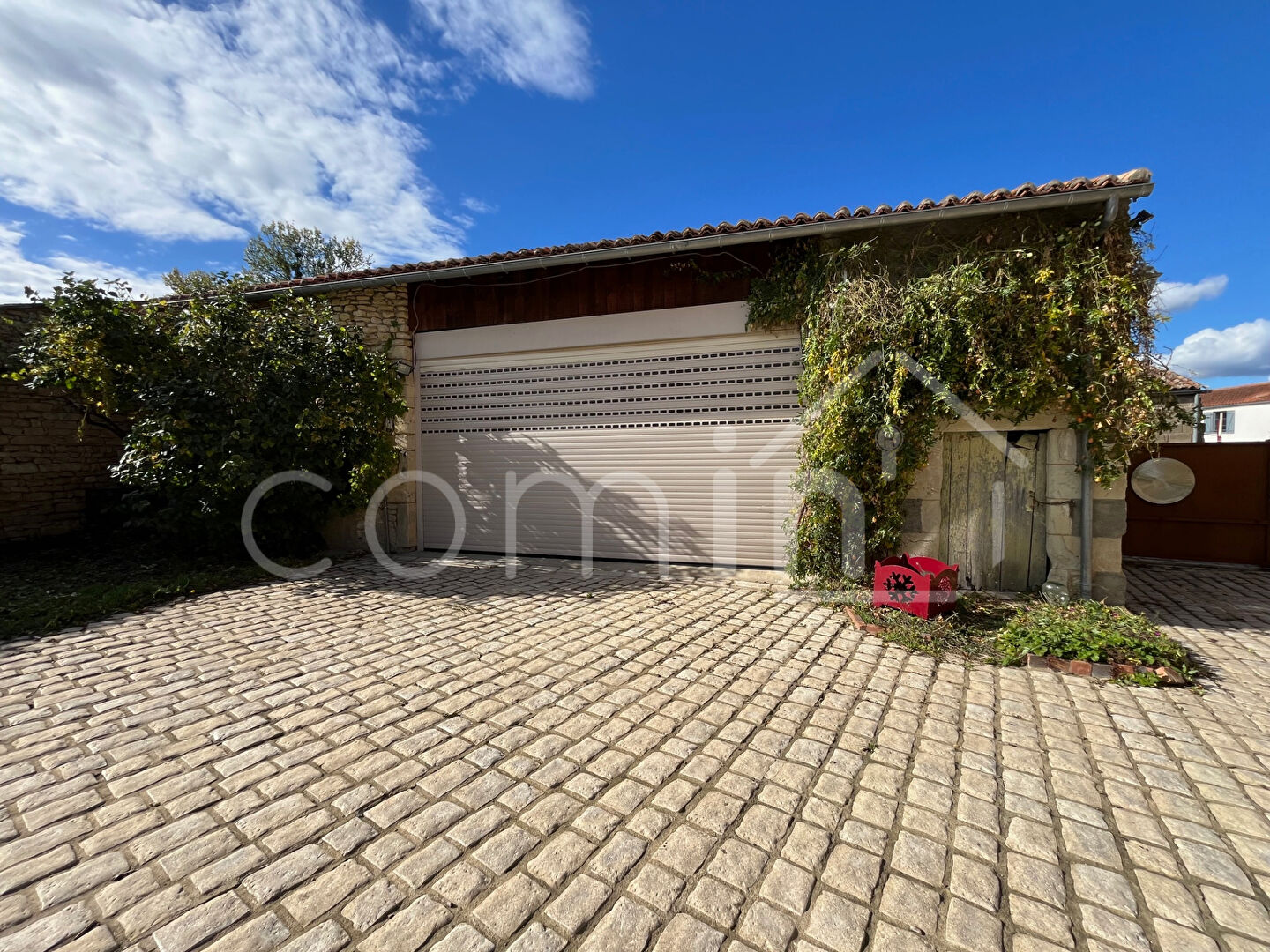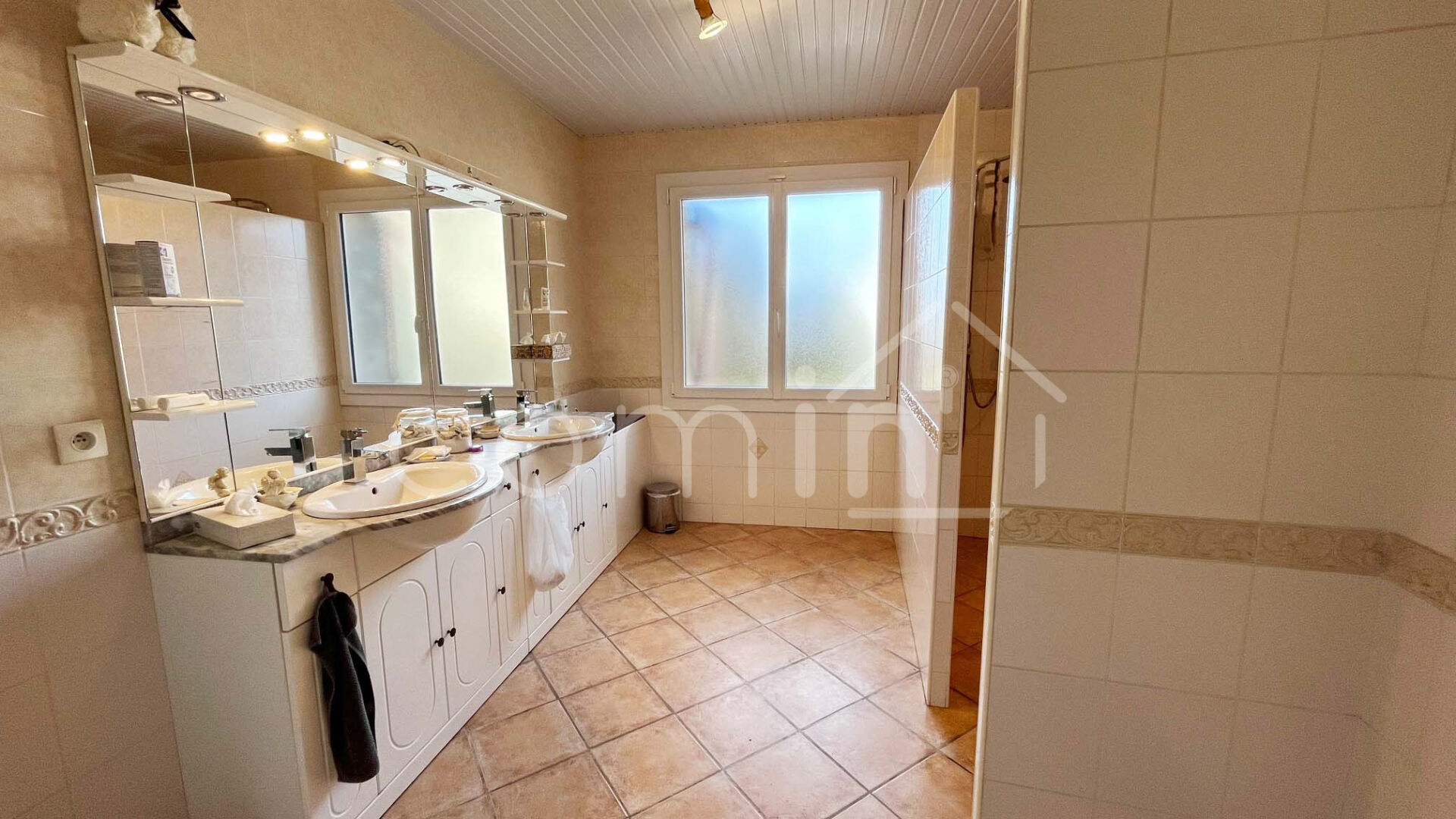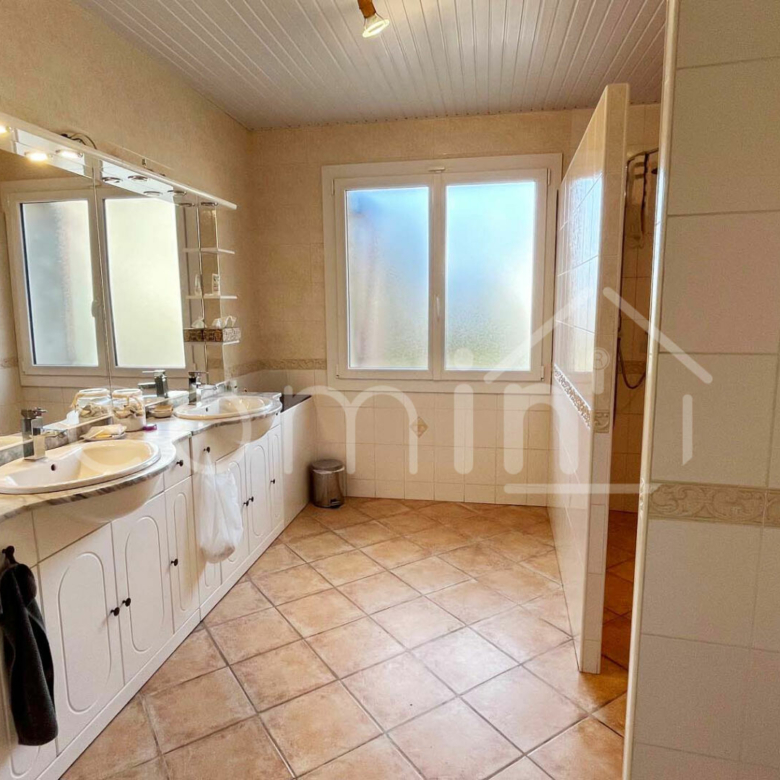 Sur le terrain d’environ 1000m² piscinable se trouvent également un grand garage double motorisé de + de 60m², une belle cave voutée, un préau, une serre.