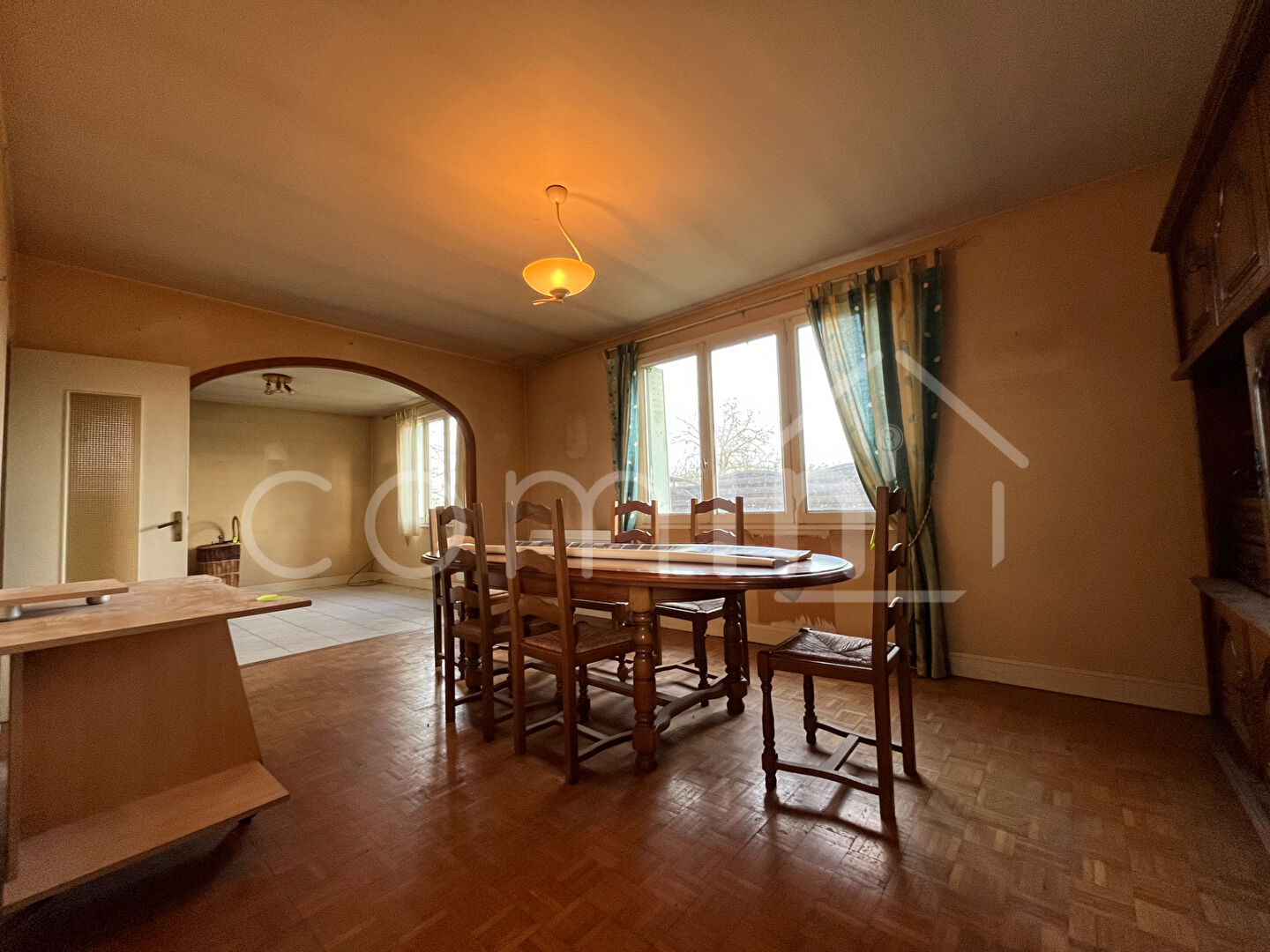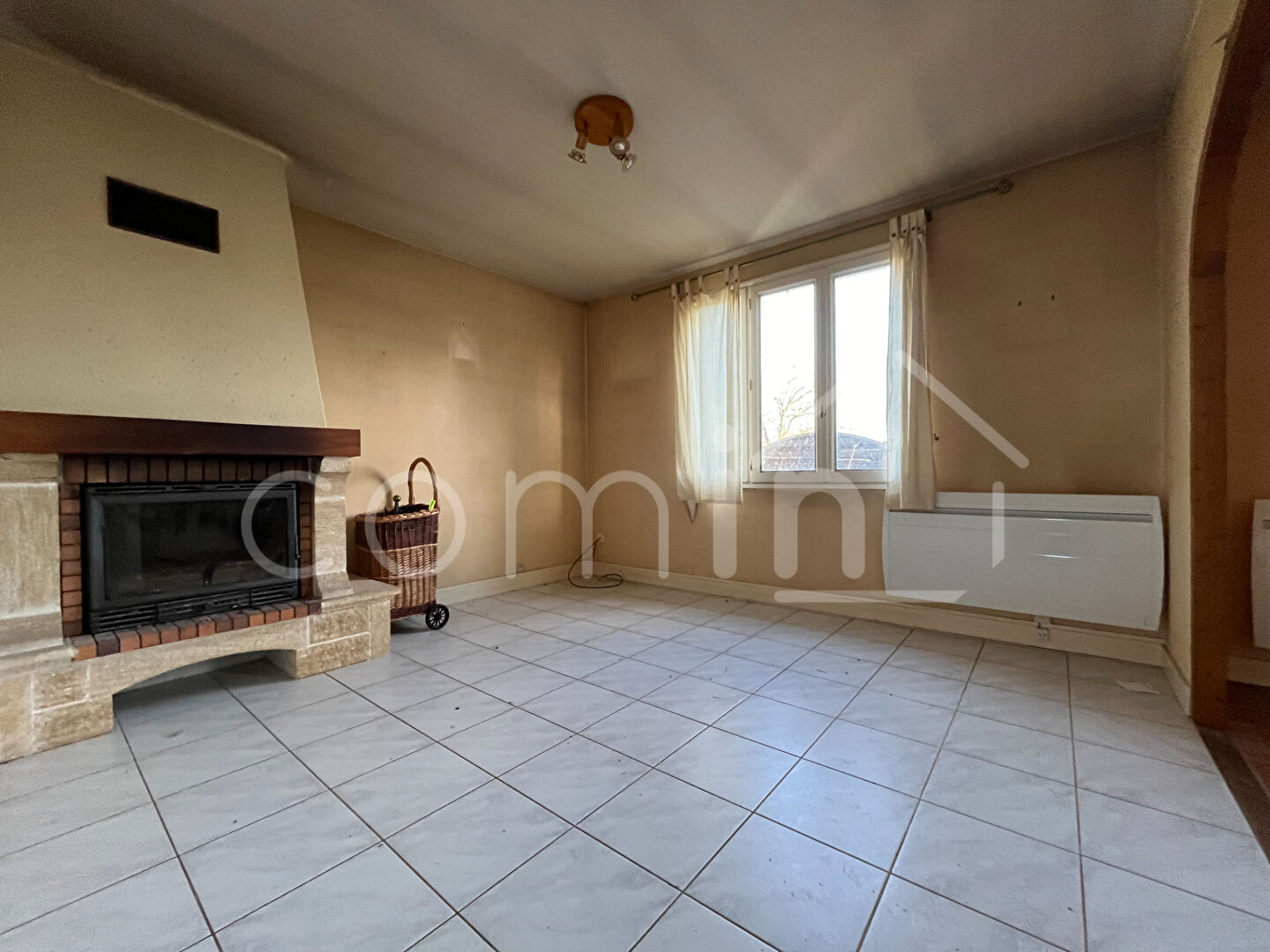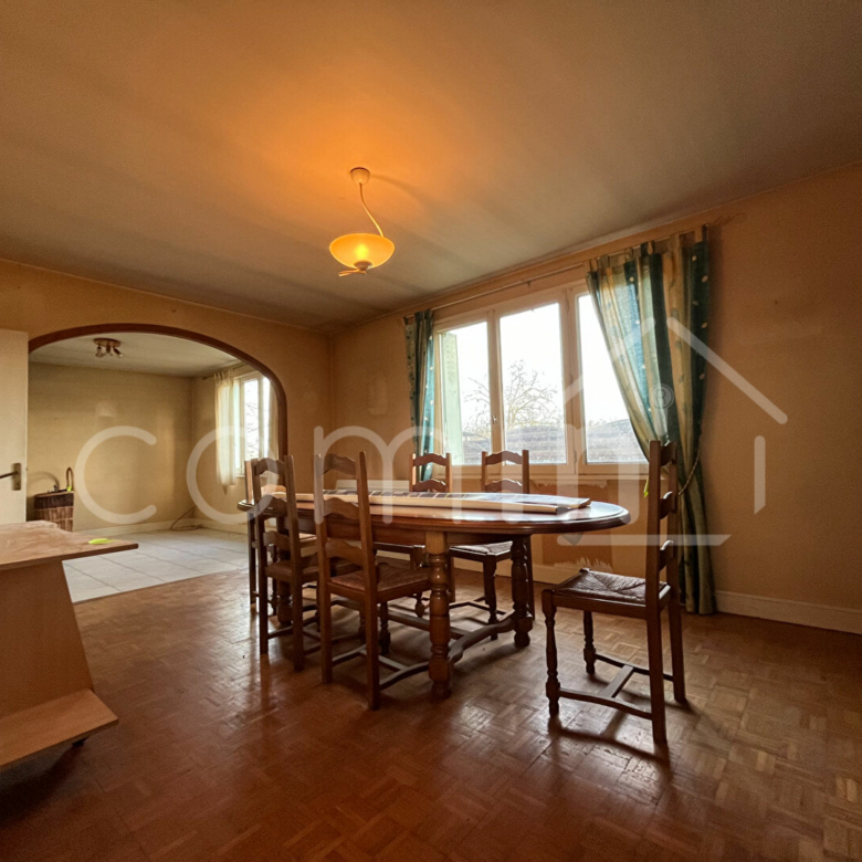 L’agencement y est parfait avec une grande entrée menant sur un dégagement desservant une cuisine à rénover, une salle à manger, un salon avec cheminée, une chambre, une salle d’eau et un wc indépendant.