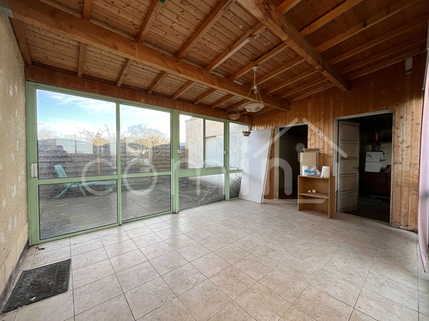 De la maison une véranda mène directement à une pièce d’eau, une chambre et au garage.